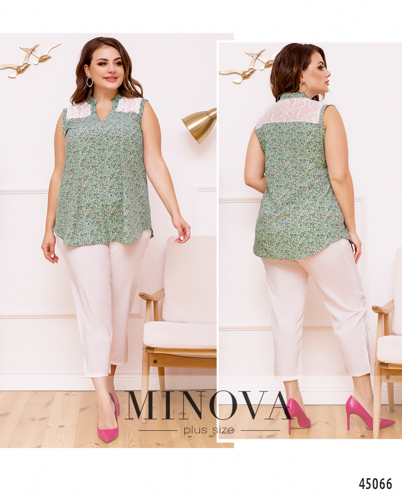 Комфортный костюм в стиле casual с яркой блузой и светлыми брюками позволит выглядеть эффектно в жаркий летний день. Изящная блуза свободного кроя с воротником-стойкой, v-образным вырезом и кружевными вставками на плечах и укороченные брюки-капри с высокой талией на резинке, без застежек, с карманами в швах – это идеальный вариант для прогулки или встреч с друзями.