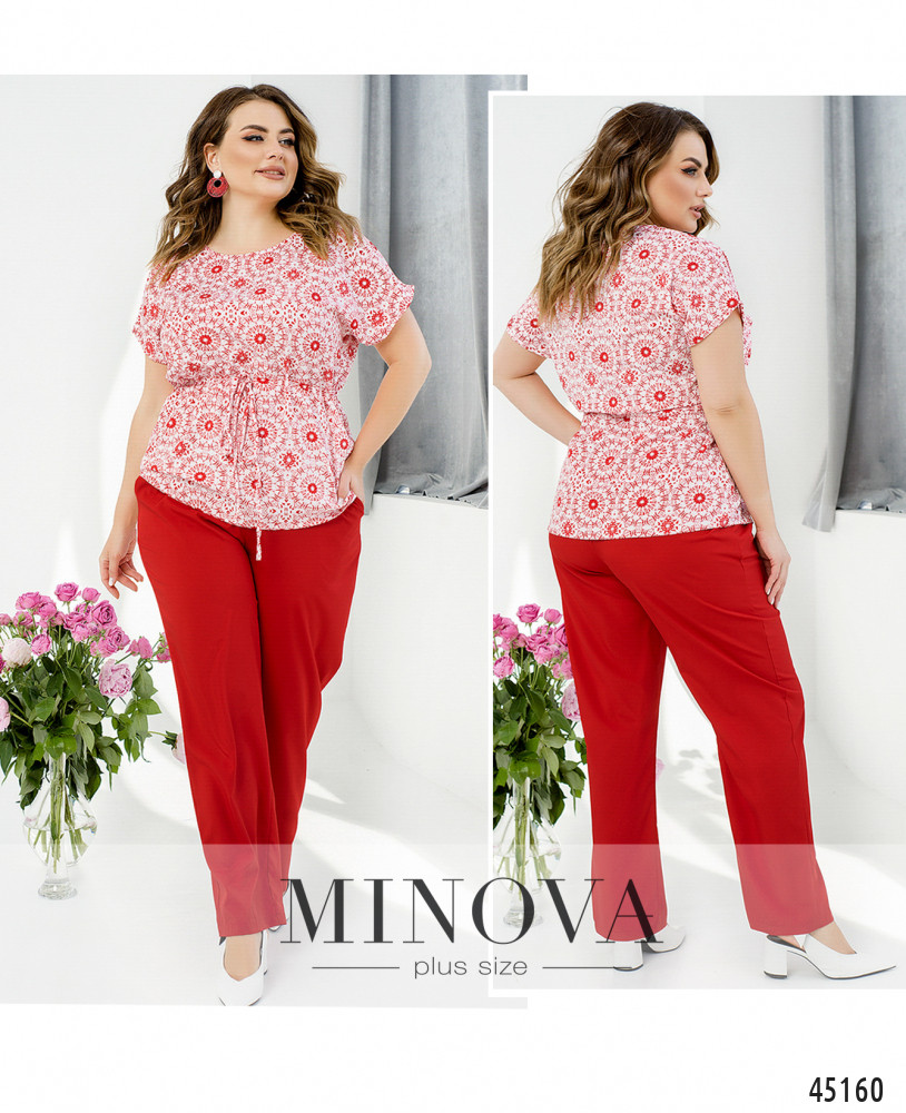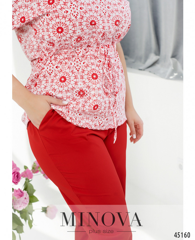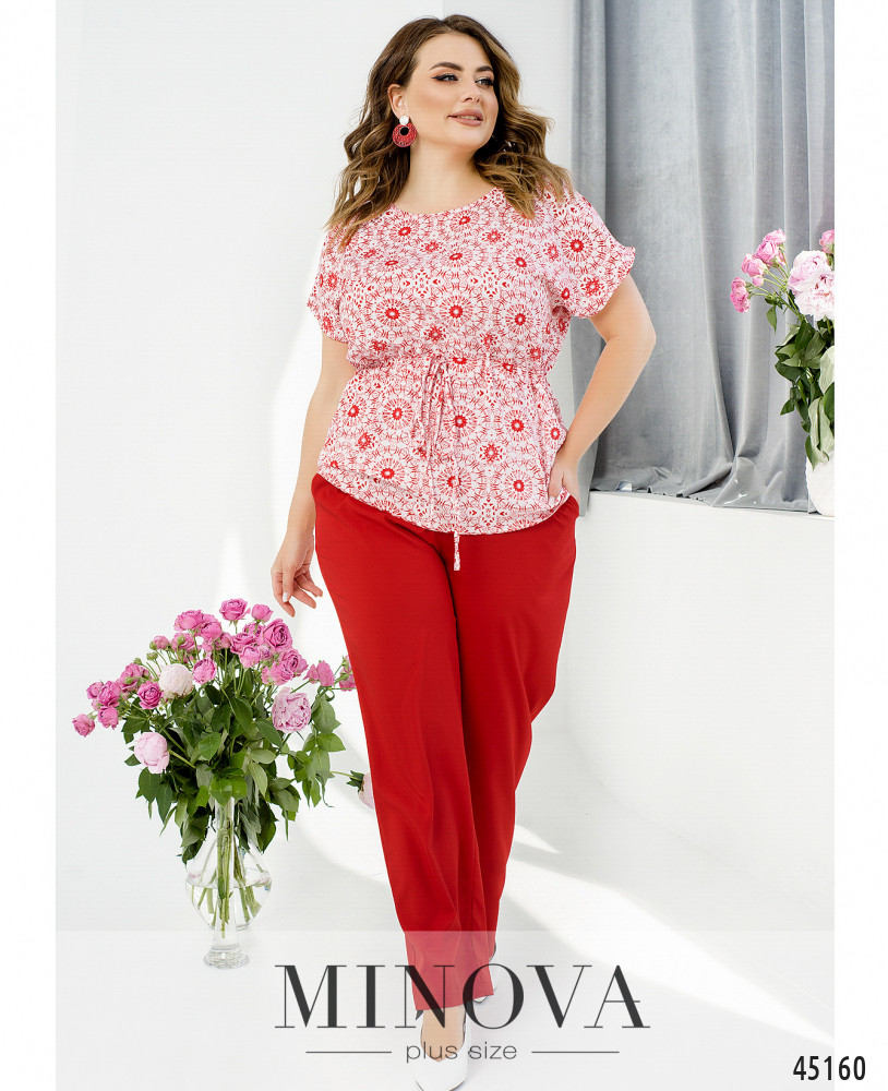 Стильный контрастный костюм из легкой ткани с блузой и брюками. Однотонные классические брюки на резинке с карманами в швах гармонично дополнены светлой блузой со спущенными рукавами и принтом в тон брюк. Благодаря тонкому пояску, пропущенному через талию, одним движением силуэт блузы меняется от прямого к приталенному.