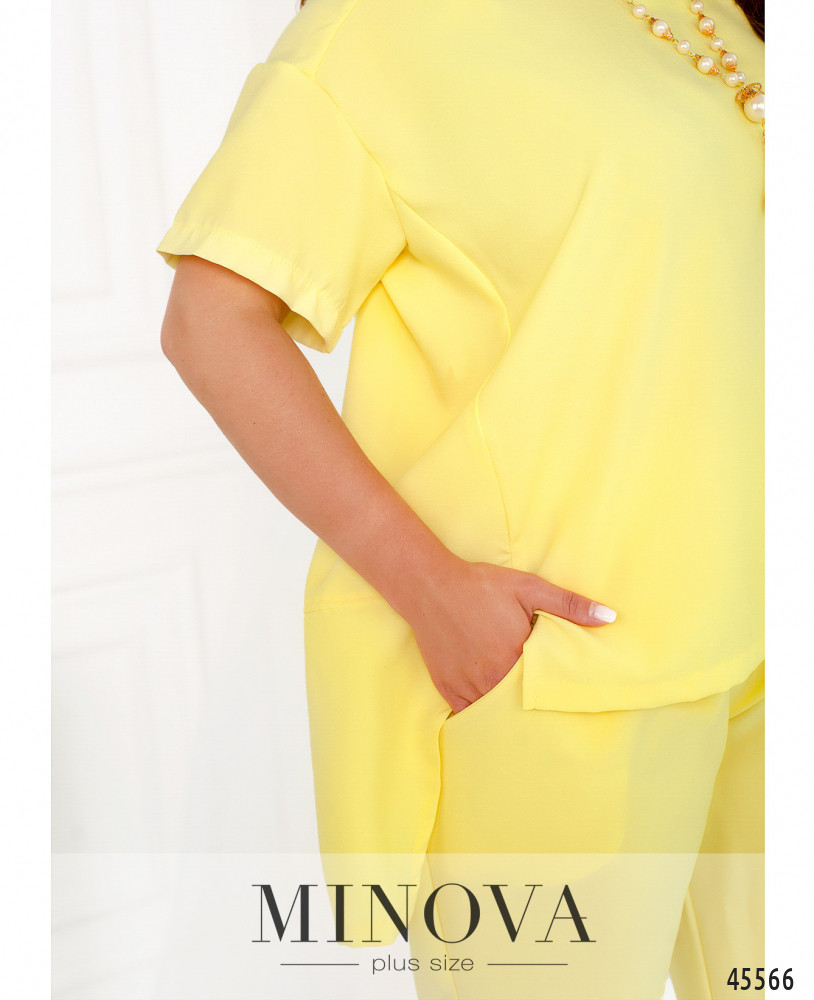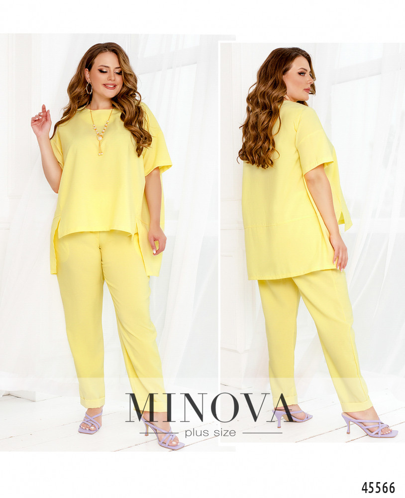 Стильный однотонный костюм, выполненный из легкой тонкой ткани – универсальное летнее решение для любой модницы. Он состоит из лаконичных брюк на резинке и блузы актуальной формы oversize. Брюки на резинке зауженной формы с манжетами дополнены декоративной ширинкой (имитацией), защипами спереди и карманами по бокам. Блуза свободного кроя обращает на себя внимание благодаря приспущенной линии плеч и ассиметричному подолу с разрезами.