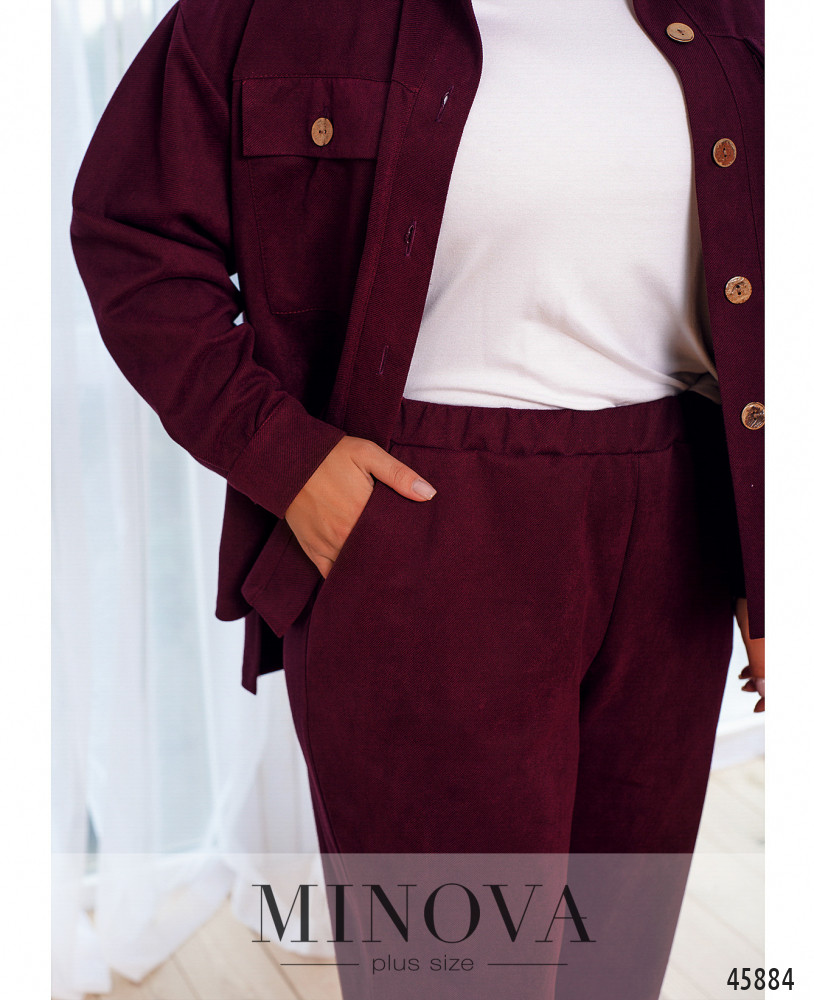 Привлекательный универсальный костюм с рубашкой и брюками можно носить вместе или разделить, создавая различные образы с другими вещами. В комплект входит рубашка с отложным воротничком, застегивающаяся на ряд пуговиц на планке спереди, с накладными карманами на груди и длинными рукава с манжетами. Костюм дополнен брюками с высокой посадкой и врезными карманами по бокам, в пояс которых вшита резинка.