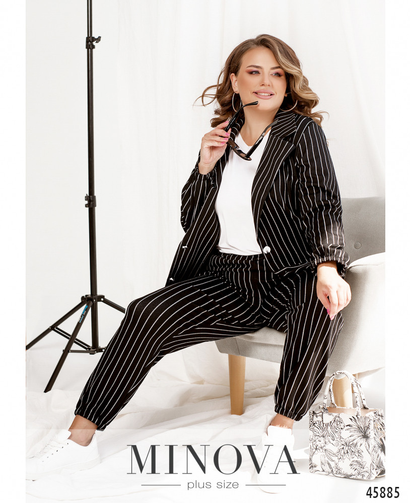 Этот деловой костюм в полоску с элементами в стиле casual может составить основу всего гардероба. Классический однобортный жакет без подкладки, застегивающийся на пуговицы, дополнен накладными карманами и резинкой на рукавах вместо манжет. В комплект также входят брюки с карманами в боковых швах и резинками, вшитыми по линии талии и на штанинах внизу.