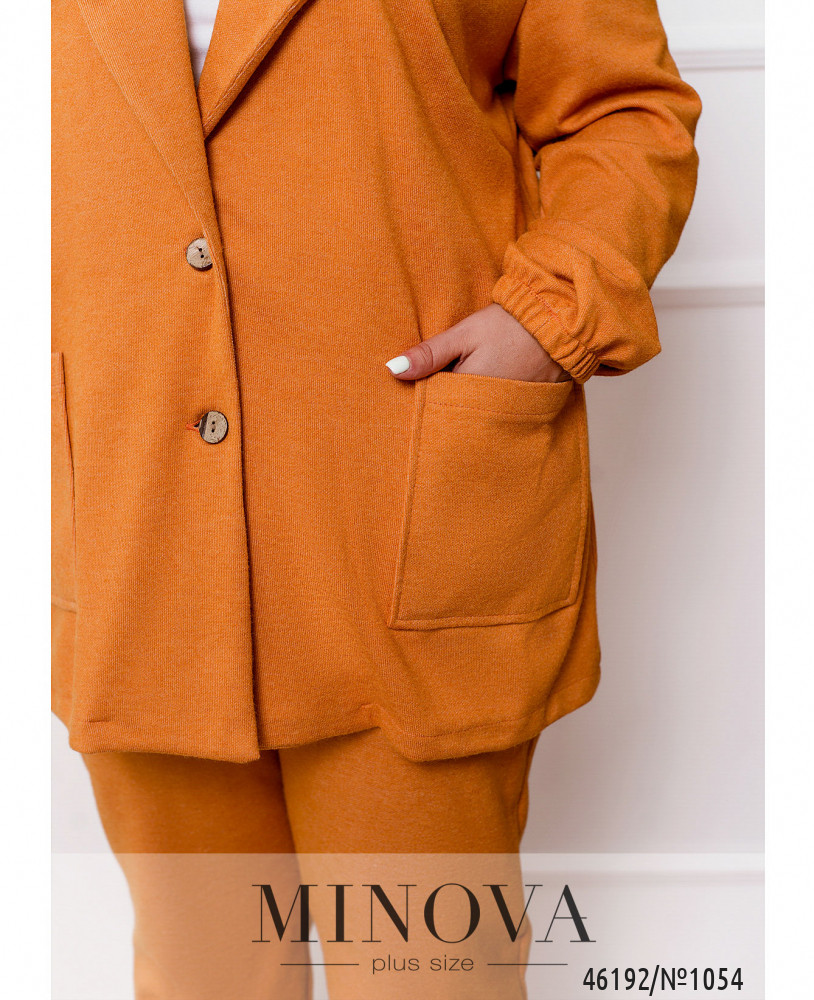 Этот однотонный деловой костюм с элементами в стиле casual может составить основу всего гардероба. Классический однобортный жакет без подкладки, застегивающийся на пуговицы, дополнен накладными карманами и резинкой на рукавах вместо манжет. В комплект также входят брюки с карманами в боковых швах и резинками, вшитыми по линии талии и на штанинах внизу. Пояс НЕ входит в комплект.