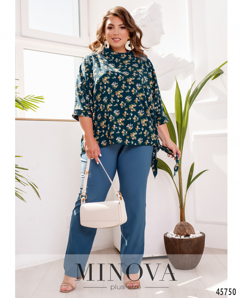 Яркий стильный костюм, состоящий из блузы и брюк, – универсальное решение для любой модницы. Воздушная выразительная блуза с рукавами "летучая мышь" длиной 3/4 и маленьким воротником-стойкой идеально дополнена лаконичными однотонными брюками прямого кроя с карманами и резинкой, вшитой по линии талии.
