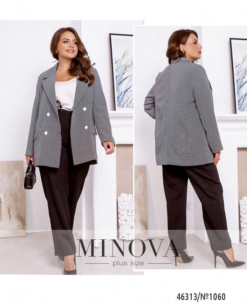 Этот костюм может стать частью разных образов, делая вас стильной, модной и изысканной. В комплект входит классический двубортный жакет с карманами и подкладкой, а также лаконичные однотонные брюки на резинке с карманами в боковых швах.