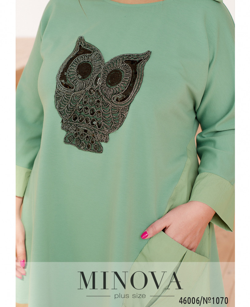Яркий костюм нестандартного кроя с декоративной аппликацией может стать любимой вещью для женщины, ценящей практичность и не забывающей о модных тенденциях. Минималистичные брюки-джоггеры на резинке с карманами дополняет выразительная туника с воротником, накладным карманом и ассиметричным низом. Особенностью данной модели являются вставки из ткани-плащевки, отличающиеся от основного цвета костюма на несколько тонов и создающие акцент на воротнике, манжетах туники и брюк, а также на накладном кармане и области вокруг него.