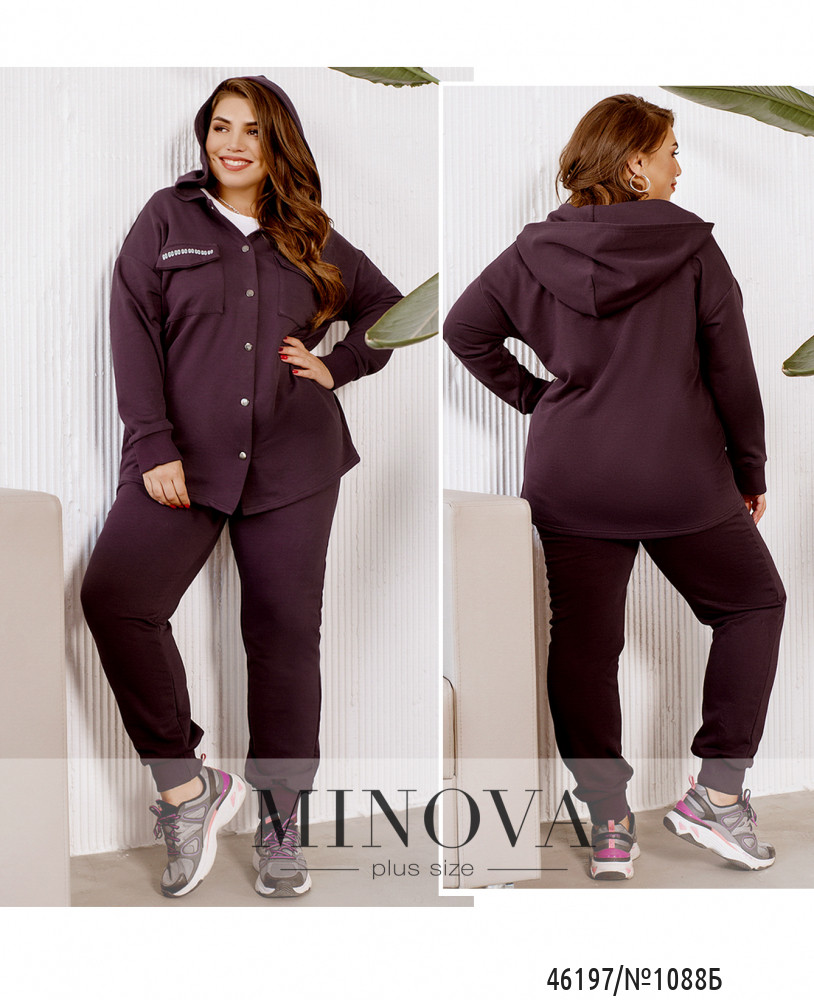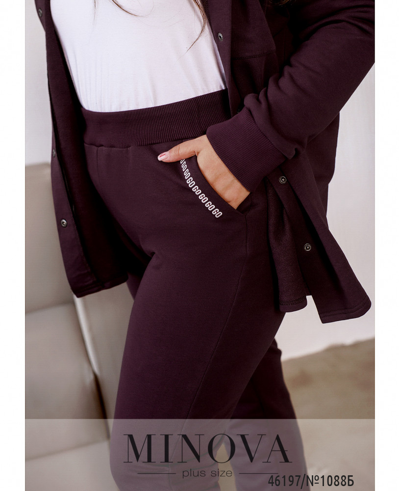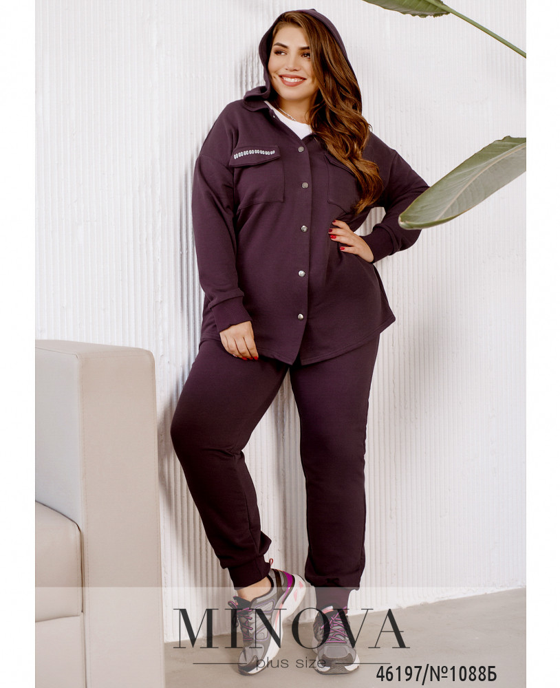 Костюм в стиле casual, выполненный из плотной мягкой ткани, прочно войдет и идеально дополнит ваш базовый осенний гардероб. Лаконичные брюки-джоггеры на резинке с карманами и манжетами идеально дополняет кофта с застежкой на кнопках, капюшоном и накладными карманами с клапанами на груди, украшенная декоративными принтами.