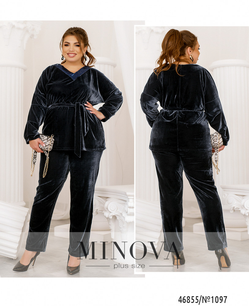 Яркий костюм, выполненный из мягкого велюра, подарит вам комфорт и придаст уверенности в своей неотразимости. В комплект входят лаконичные брюки на резинке с карманами и туника свободного кроя, украшенная сияющими пайетками в области горловины.