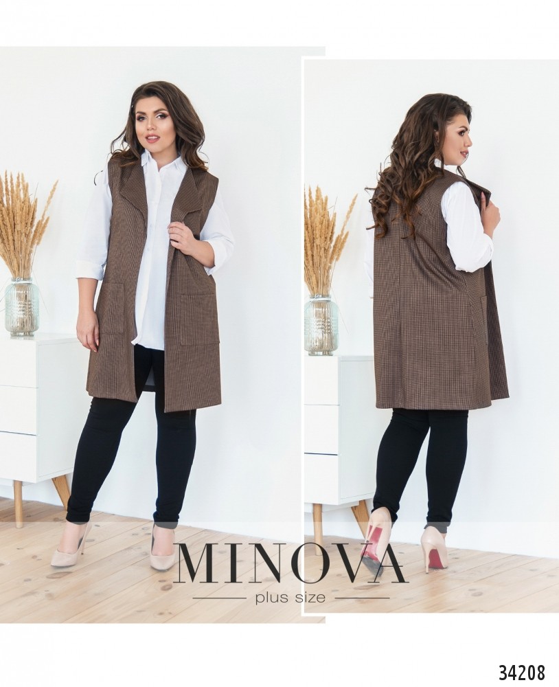 Стильный городской костюм прекрасно выглядит, если в его составе есть жилетка. В представленной в новом каталоге Minova модели костюм-двойка состоит из длинной жилетки и брюк. Жилетка из мягкой, но плотной ткани, с мягкими небольшими лацканами, а также в наличии два накладных кармана по бокам. Застёжек и пояса в комплекте нет, так что жилетка по фасону напоминает кардиган. Брюки из мягкой эластичной ткани, со вшитой в пояс резинкой и карманами по бокам. Костюм можно дополнить яркими аксессуарами и удобной обувью. В каталоге представлены однотонные модели и модель с неброским принтом на сером фоне.