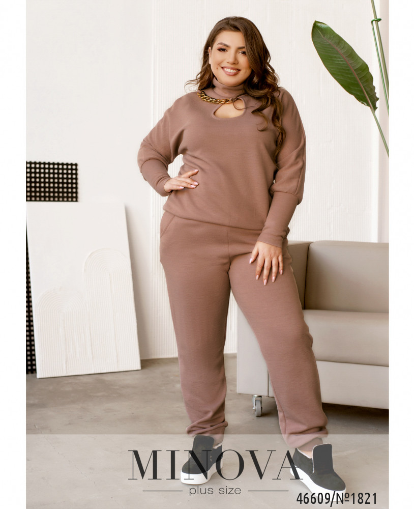 Стильный монохромный костюм, выполненный из теплой мягкой ткани, выручит, когда нужно согреться и при этом выглядеть стильно. В комплект входят минималистичные брюки-джоггеры на резинке с карманами и манжетами, а также однотонный гольф свободного кроя с вырезом в форме капли, украшенный декоративной цепью.