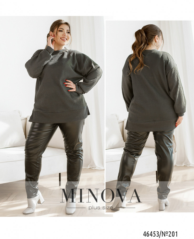Женственный костюм, состоящий из брюк и туники, можно носить вместе или разделить, создавая различные образы с другими вещами. Минималистичные черные брюки на резинке с карманами, выполненные из эко кожи, идеально дополнены мягкой однотонной туникой с приспущенной линией плеч и небольшими разрезами по бокам.