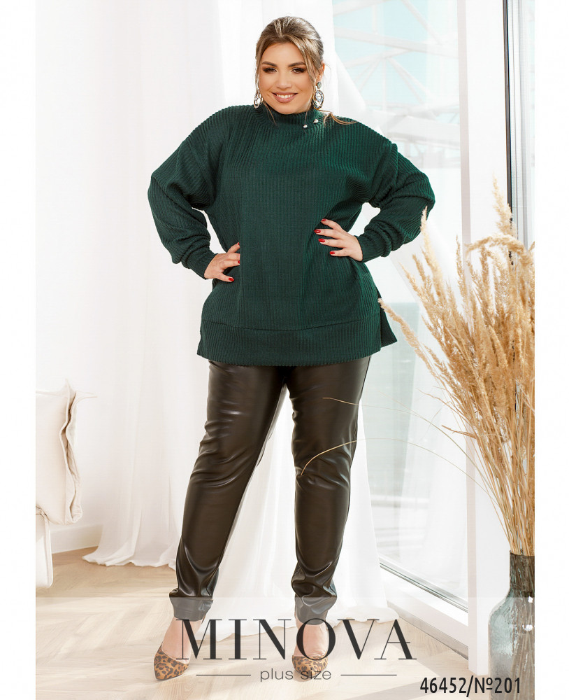 Женственный костюм, состоящий из брюк и туники, можно носить вместе или разделить, создавая различные образы с другими вещами. Минималистичные черные брюки на резинке с карманами, выполненные из эко кожи, идеально дополнены мягкой однотонной туникой с приспущенной линией плеч и небольшими разрезами по бокам.