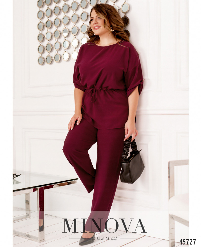 Минималистичный костюм батал, футболка без застежек и карманов, через талию под кулиской пропущен шнурок, по бокам подола - разрезы. Вырез горловины полукруглый. На рукавах небольшие отвороты. Брюки с высокой талией, в пояс вшита резинка, по бокам - карманы в шве.