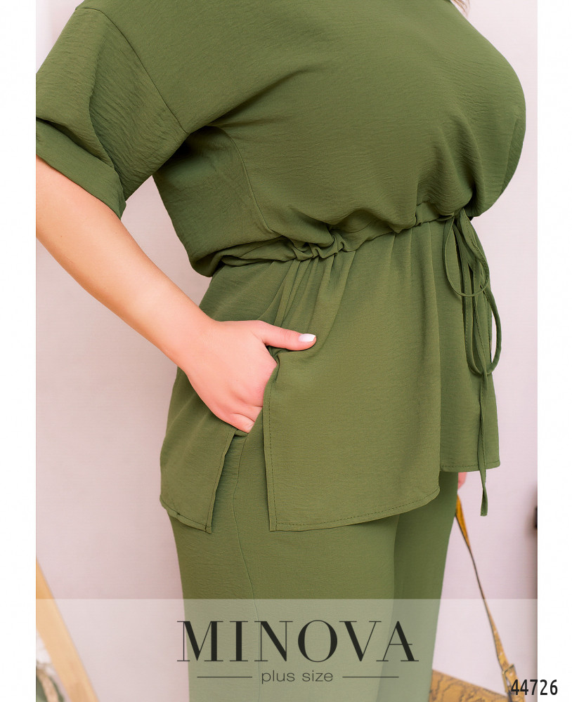 Минималистичный костюм батал, футболка без застежек и карманов, через талию под кулиской пропущен шнурок, по бокам подола - разрезы. Вырез горловины полукруглый. На рукавах небольшие отвороты. Брюки с высокой талией, в пояс вшита резинка, по бокам - карманы в шве.