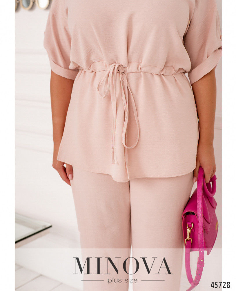 Минималистичный костюм батал, футболка без застежек и карманов, через талию под кулиской пропущен шнурок, по бокам подола - разрезы. Вырез горловины полукруглый. На рукавах небольшие отвороты. Брюки с высокой талией, в пояс вшита резинка, по бокам - карманы в шве.