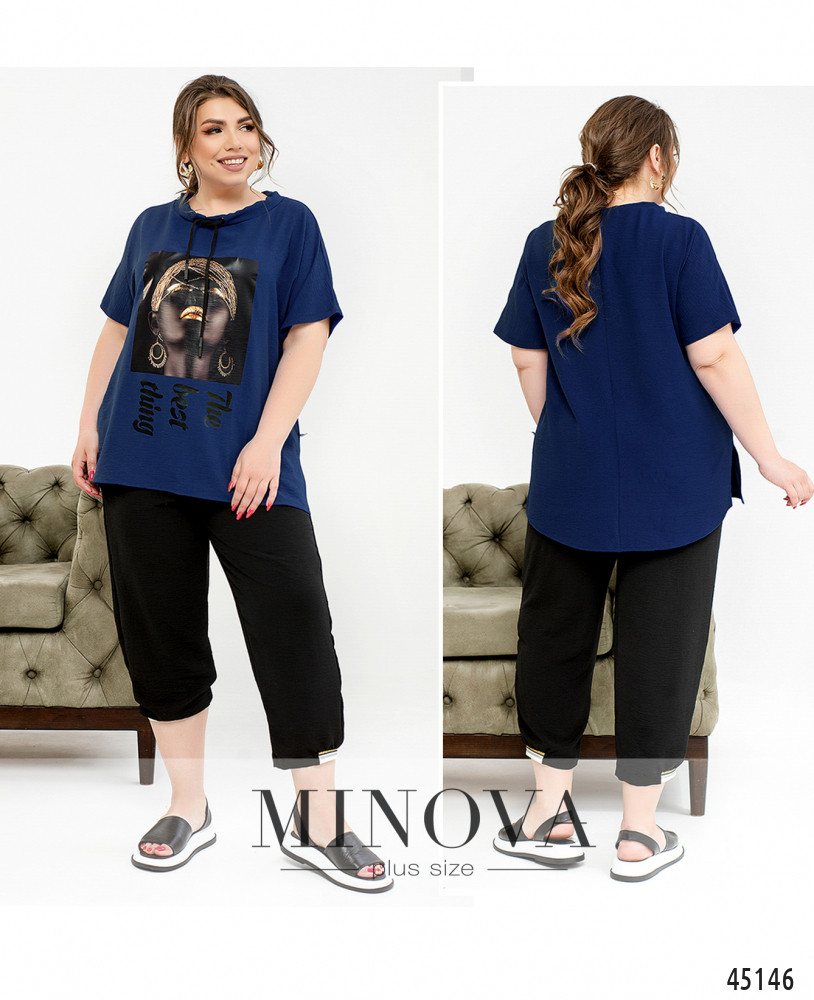 Легкий контрастный костюм в стиле casual туникой и брюками-капри сделает вас еще ярче этим летом. Невесомая туника с подвижным декоративным шнурком в полукруглом вырезе горловины и спущенными короткими рукавами декорирована креативным принтом. Ее дополняют темные укороченные брюки-капри с резинками, вшитыми в пояс и в манжеты штанин.