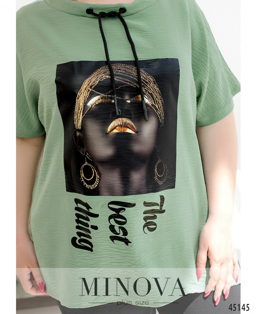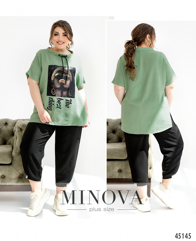 Легкий контрастный костюм в стиле casual туникой и брюками-капри сделает вас еще ярче этим летом. Невесомая туника с подвижным декоративным шнурком в полукруглом вырезе горловины и спущенными короткими рукавами декорирована креативным принтом. Ее дополняют темные укороченные брюки-капри с резинками, вшитыми в пояс и в манжеты штанин.