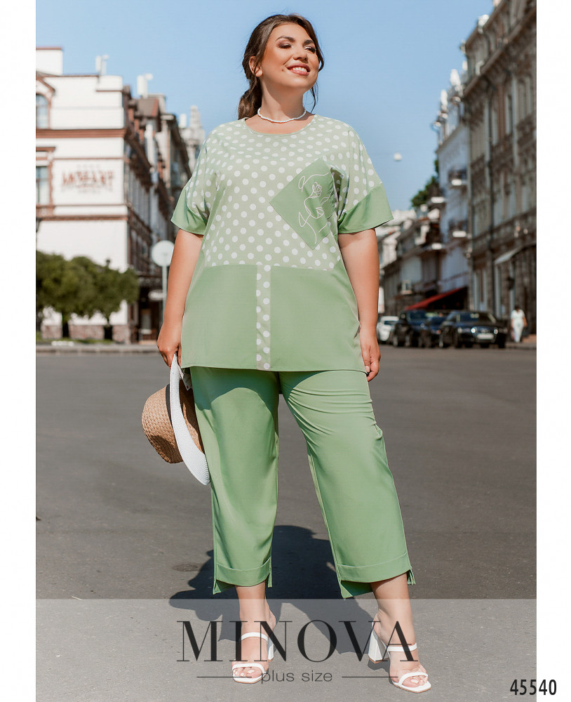 Легкий комфортный костюм с удлиненной блузой и укороченными брюками - идеальный вариант для теплой весны и жаркого лета. Блуза свободного кроя с небольшими разрезами по бокам и короткими рукавами с приспущенной линией плеч выполнена из двух видов тканей: однотонной и в горошек, а также дополнена квадратным карманом с декоративным принтом на груди. Лаконичные брюки-капри на резинке с карманами в боковых швах, асимметричным низом и манжетами только на передней части отличаются удобством и практичностью.