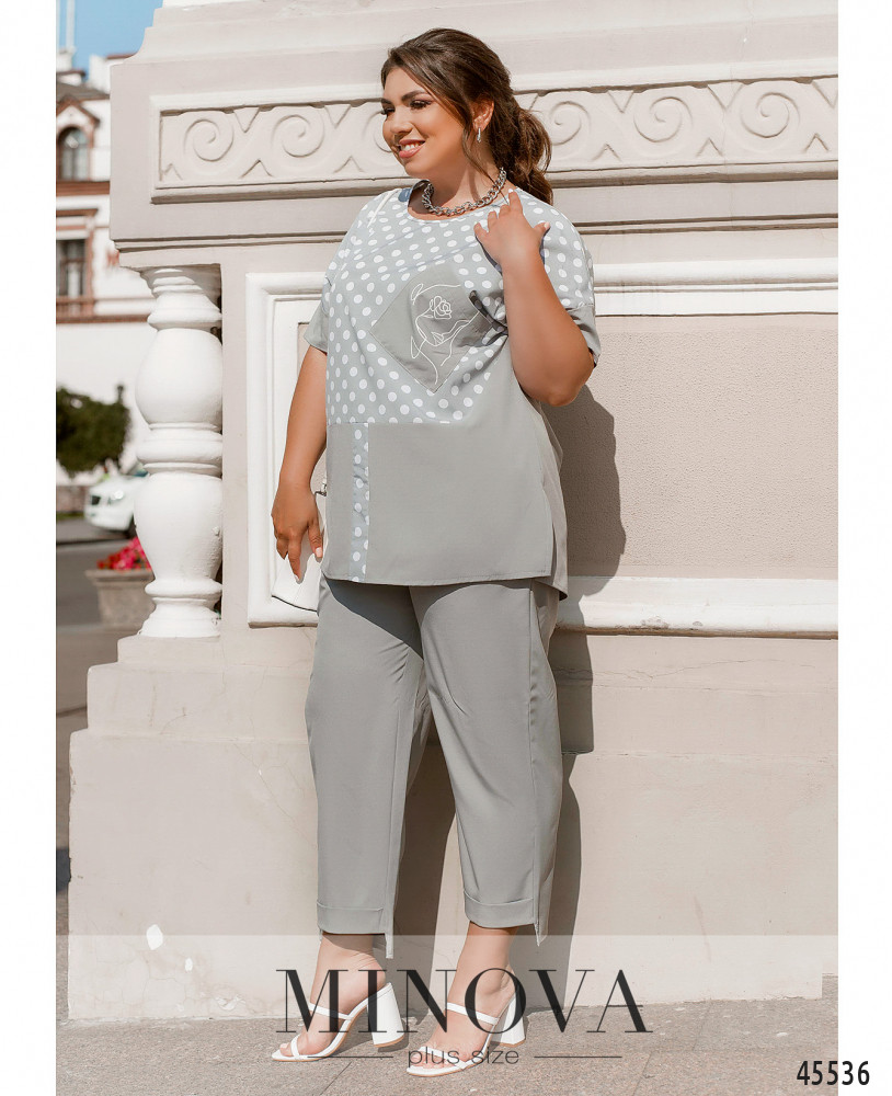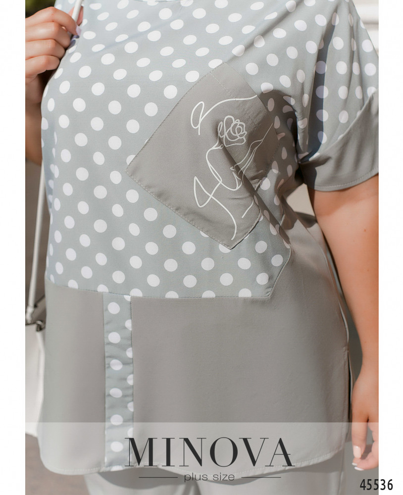 Легкий комфортный костюм с удлиненной блузой и укороченными брюками - идеальный вариант для теплой весны и жаркого лета. Блуза свободного кроя с небольшими разрезами по бокам и короткими рукавами с приспущенной линией плеч выполнена из двух видов тканей: однотонной и в горошек, а также дополнена квадратным карманом с декоративным принтом на груди. Лаконичные брюки-капри на резинке с карманами в боковых швах, асимметричным низом и манжетами только на передней части отличаются удобством и практичностью.