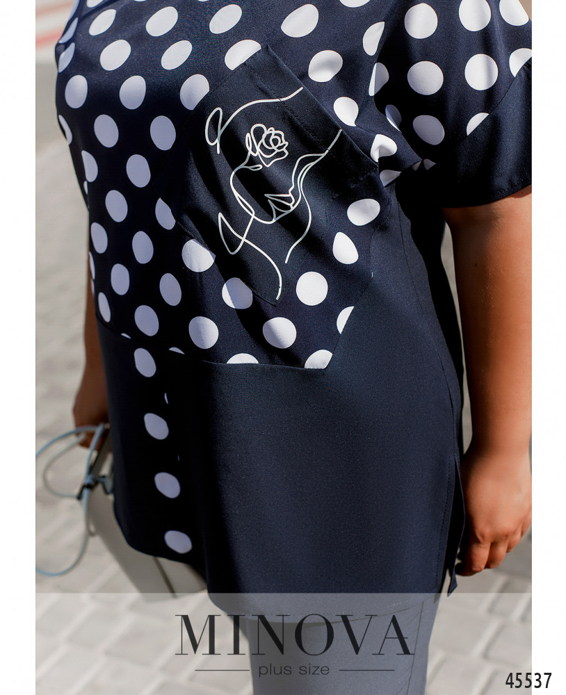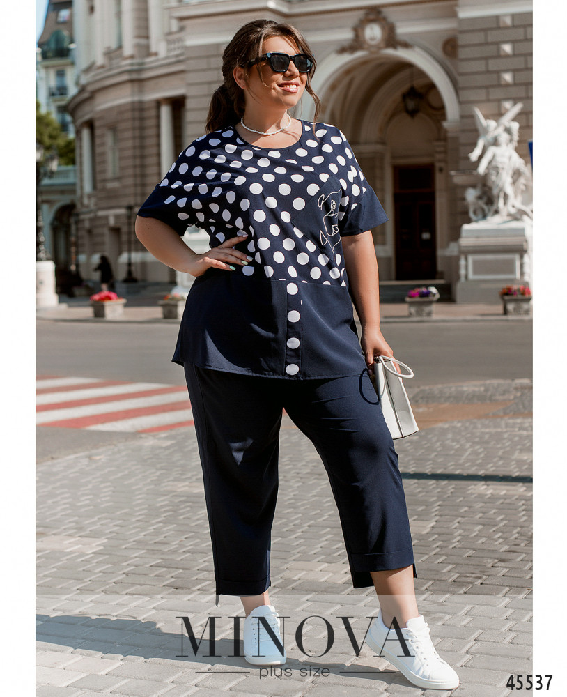 Легкий комфортный костюм с удлиненной блузой и укороченными брюками - идеальный вариант для теплой весны и жаркого лета. Блуза свободного кроя с небольшими разрезами по бокам и короткими рукавами с приспущенной линией плеч выполнена из двух видов тканей: однотонной и в горошек, а также дополнена квадратным карманом с декоративным принтом на груди. Лаконичные брюки-капри на резинке с карманами в боковых швах, асимметричным низом и манжетами только на передней части отличаются удобством и практичностью.