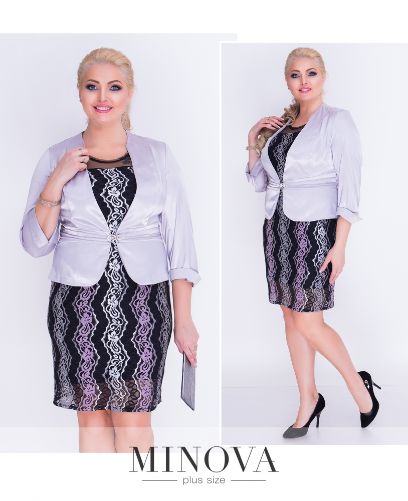 Отрезное от груди кружевное платье на подкладке с сетчатым коротким рукавом и атласным жакетом. Приталенный жакет с рукавами ¾ с манжетами застегивается на крючок в виде броши.