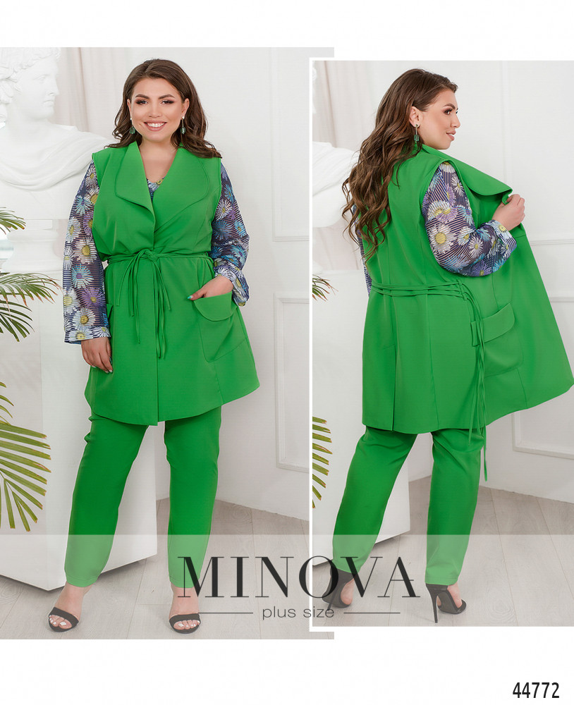 Стильный и оригинальный костюм-тройка. Жилетка с широкими мягкими отворотами-лацканами, накладными карманами с отворотами-"клапанами", без застёжек. На талии по бокам - по три петельки, через них пропущено три шнурка. Фасон сложнокроенный. Блуза без застёжек и карманов, с полукруглым вырезом горловины, рукава с мягкими манжетами без пуговиц. Брюки с высокой талией, без карманов, в пояс вшита резинка, застёжек нет.