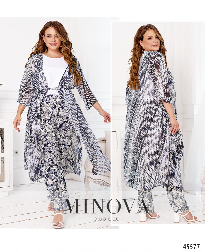 Яркий летний костюм-тройка – универсальное решение для любой модницы. В комплект входят брюки прямого кроя на резинке с карманами в боковых швах, выполненные из ткани с контрастным принтом, лаконичная белая майка и невесомый шифоновый кардиган без застежек с рукавами длиной 3/4.