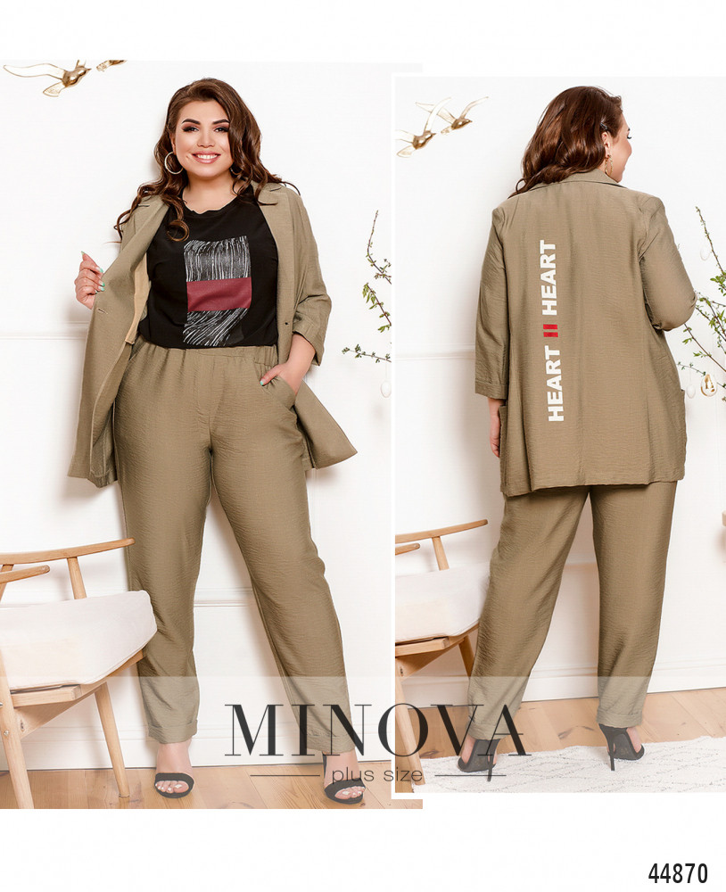 Стильный костюм-тройка батал в стиле casual. Пиджак с подкладкой от плеч до талии, застёгивается на одну пуговицу, в наличии подплечники, рукава без пуговиц, с отворотами. На спине продольный принт. По бокам - накладные карманы. Футболка с принтом, без застёжек и карманов, вырез горловины полукруглый. Брюки с отворотами, застёгиваются на пуговицу и молнию под змейкой, на талии шлейки для пояса, посадка высокая, по бокам - карманы в шве.