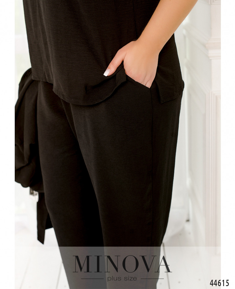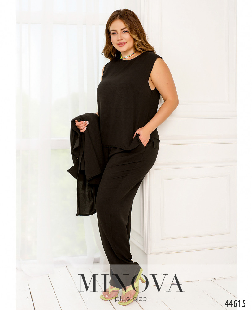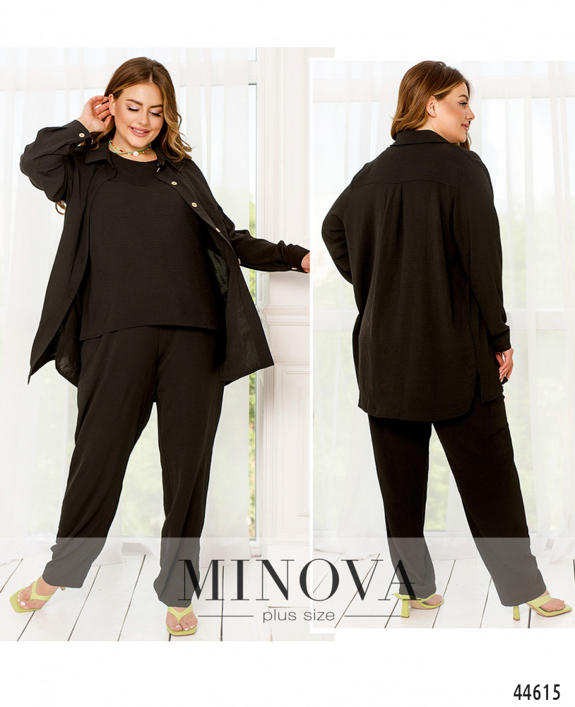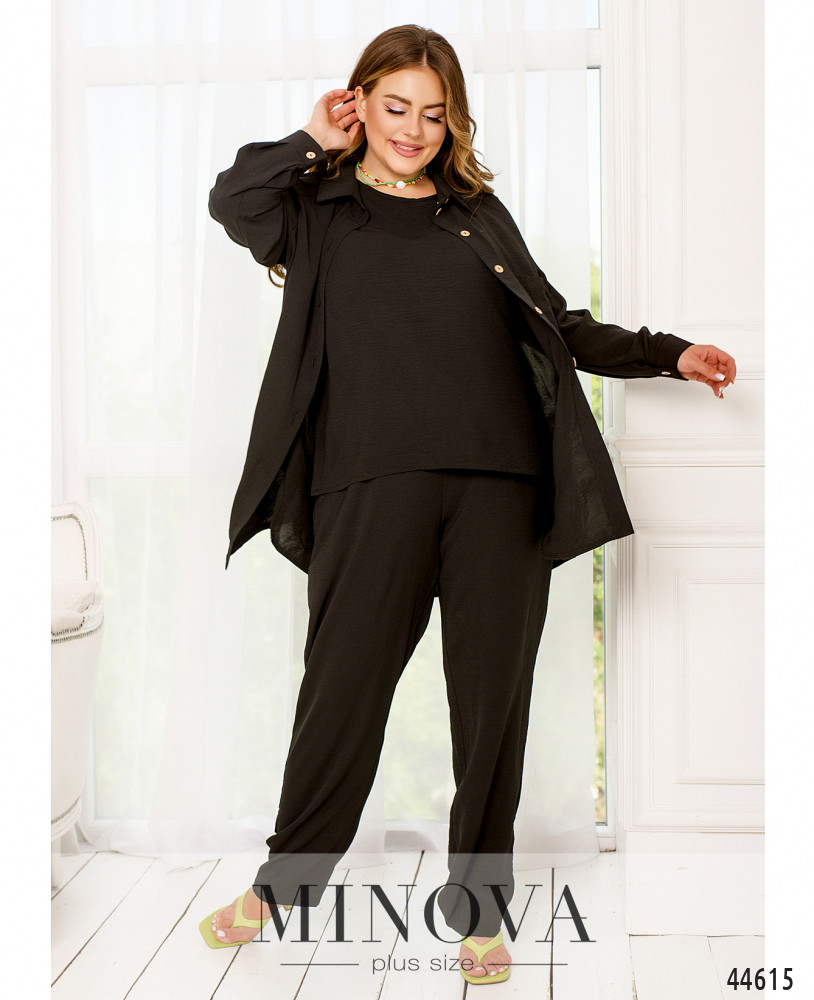 Элегантный и стильный костюм тройка большого размера. Верхняя рубашка удлинённая, с отложным воротничком, на груди накладной карман, по бокам - длинные разрезы. На рукавах манжеты, на манжетах по одной пуговке. Брюки с высокой талией, по бокам - карманы в шве, в пояс вшита резинка. Майка с полукруглым вырезом горловины, на груди вытачки, по бокам подола - разрезы. Без карманов и застежек.