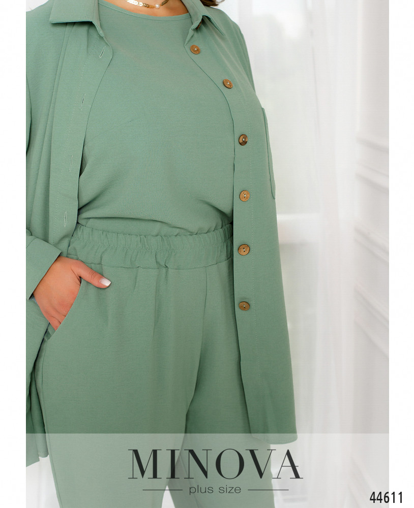 Элегантный и стильный костюм тройка большого размера. Верхняя рубашка удлинённая, с отложным воротничком, на груди накладной карман, по бокам - длинные разрезы. На рукавах манжеты, на манжетах по одной пуговке. Брюки с высокой талией, по бокам - карманы в шве, в пояс вшита резинка. Майка с полукруглым вырезом горловины, на груди вытачки, по бокам подола - разрезы. Без карманов и застежек.
