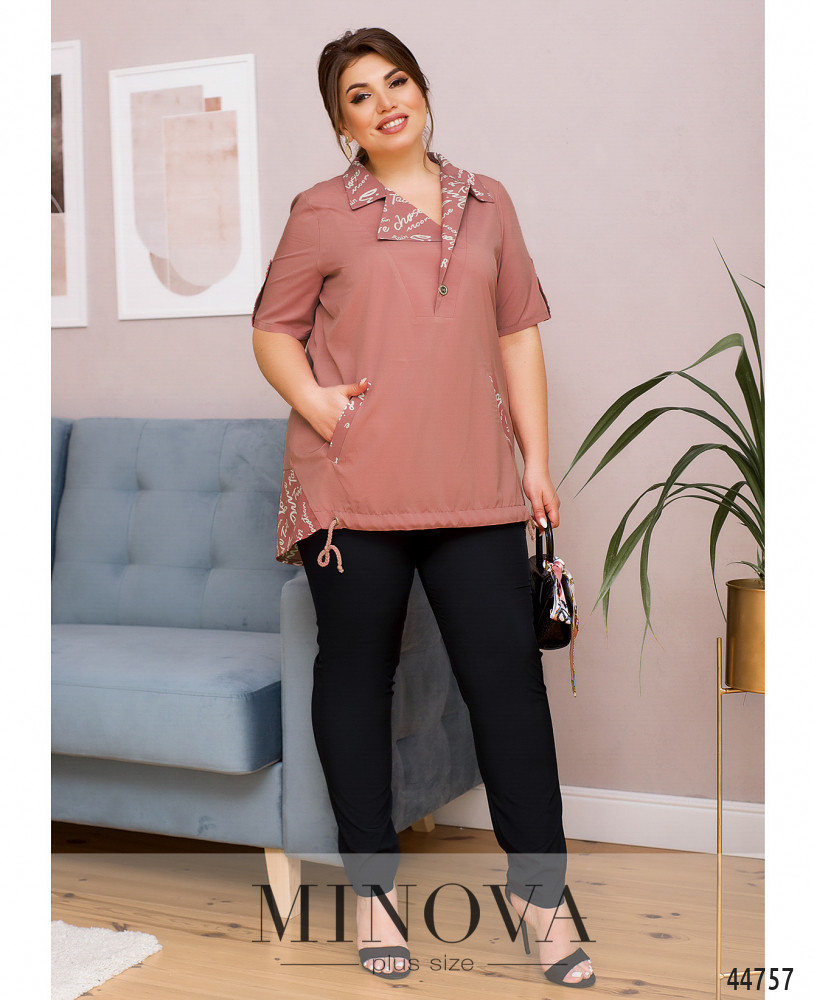 Яркий и стильный костюм батал, блуза с отложным широким воротничком, декорированным принтом. Такой же принт на декоративных регулировочных лентах и на листочках карманов в шве, а также на подоле. Через подол пропущен шнурок. Застёжка - ряд пуговиц до груди, рукава без манжет. Брюки с высокой талией, в пояс вшита резинка, по бокам - карманы в шве, без застёжек.