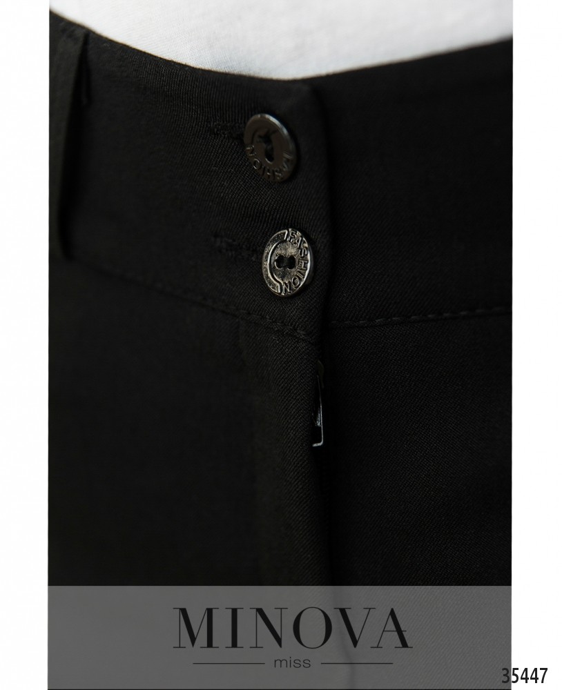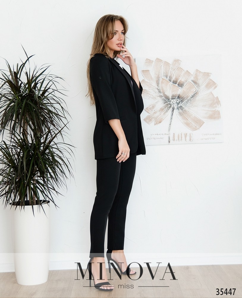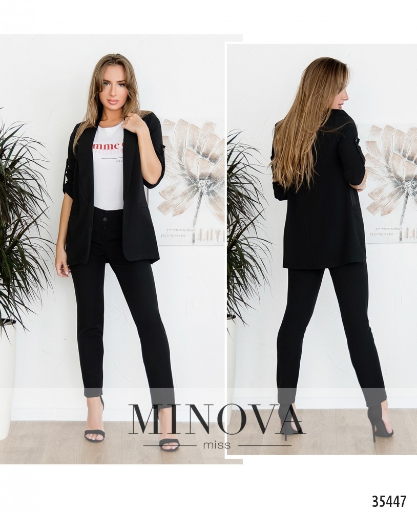 Стильный, удобный, идеальный для твоего офисного дресс-кода костюм-двойка из очень мягкой и приятной ткани! Minova представляет модель, которая подойдёт как для официальных встреч, так и для повседневного ношения. Пиджак с неширокими лацканами, без застёжек, по бокам – декоративные клапаны. Рукава полной длины, регулируются на пуговку и ленту. Брюки с высокой посадкой, к низу чуть уже, чем на бёдрах. На поясе – две пуговицы и молния под ширинкой, есть шлейки для ремня, по бокам – врезные карманы. Сочетай такой костюм с симпатичной блузой и туфельками на каблуке!