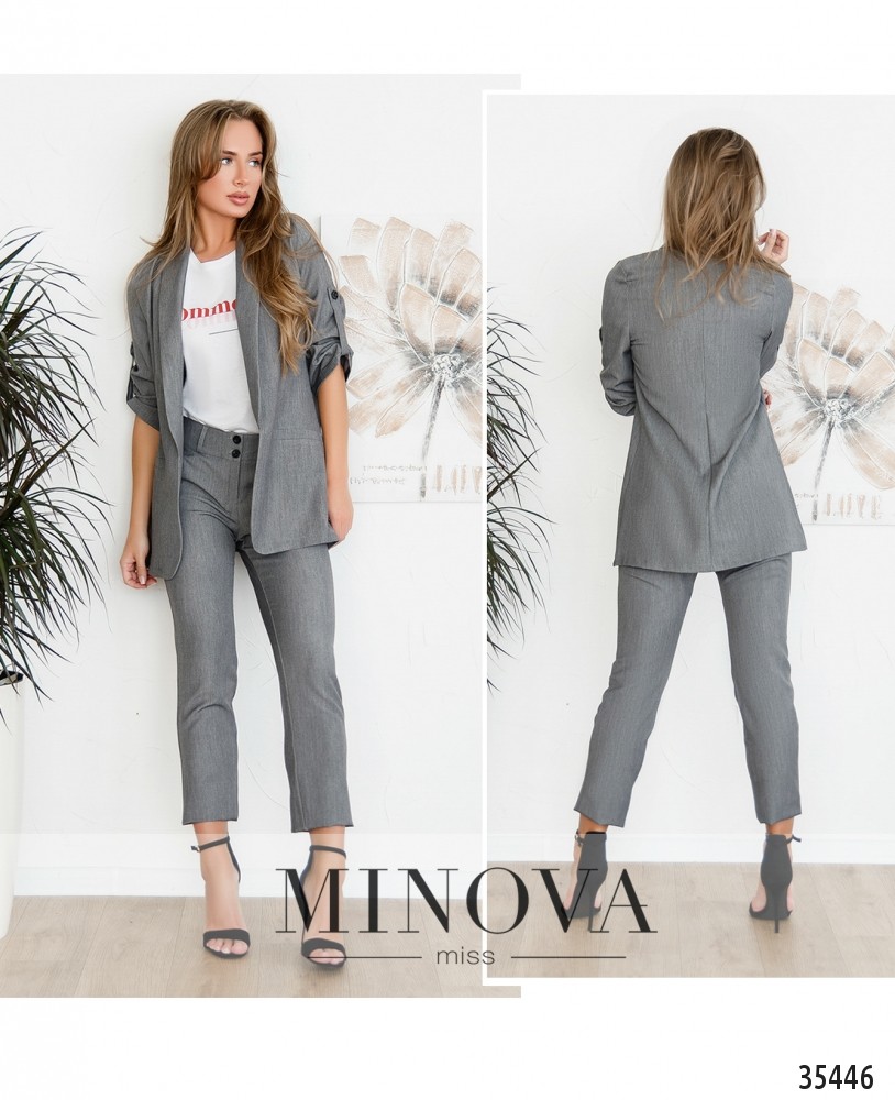 Стильный, удобный, идеальный для твоего офисного дресс-кода костюм-двойка из очень мягкой и приятной ткани! Minova представляет модель, которая подойдёт как для официальных встреч, так и для повседневного ношения. Пиджак с неширокими лацканами, без застёжек, по бокам – декоративные клапаны. Рукава полной длины, регулируются на пуговку и ленту. Брюки с высокой посадкой, к низу чуть уже, чем на бёдрах. На поясе – две пуговицы и молния под ширинкой, есть шлейки для ремня, по бокам – врезные карманы. Сочетай такой костюм с симпатичной блузой и туфельками на каблуке!