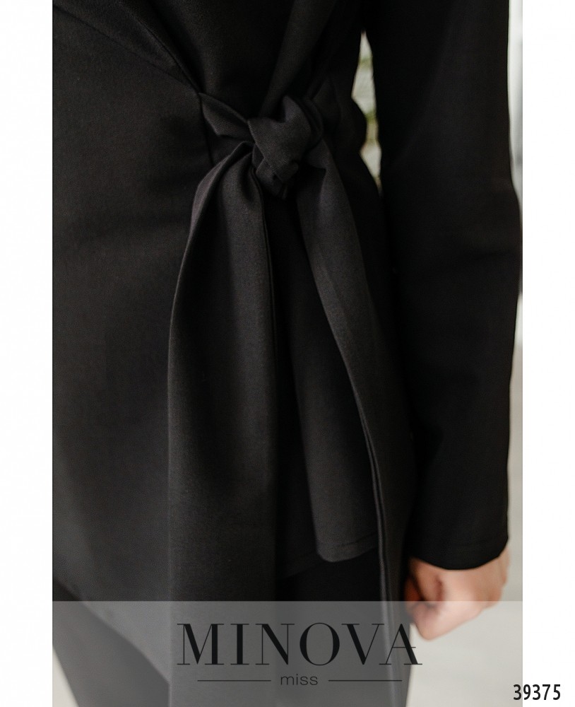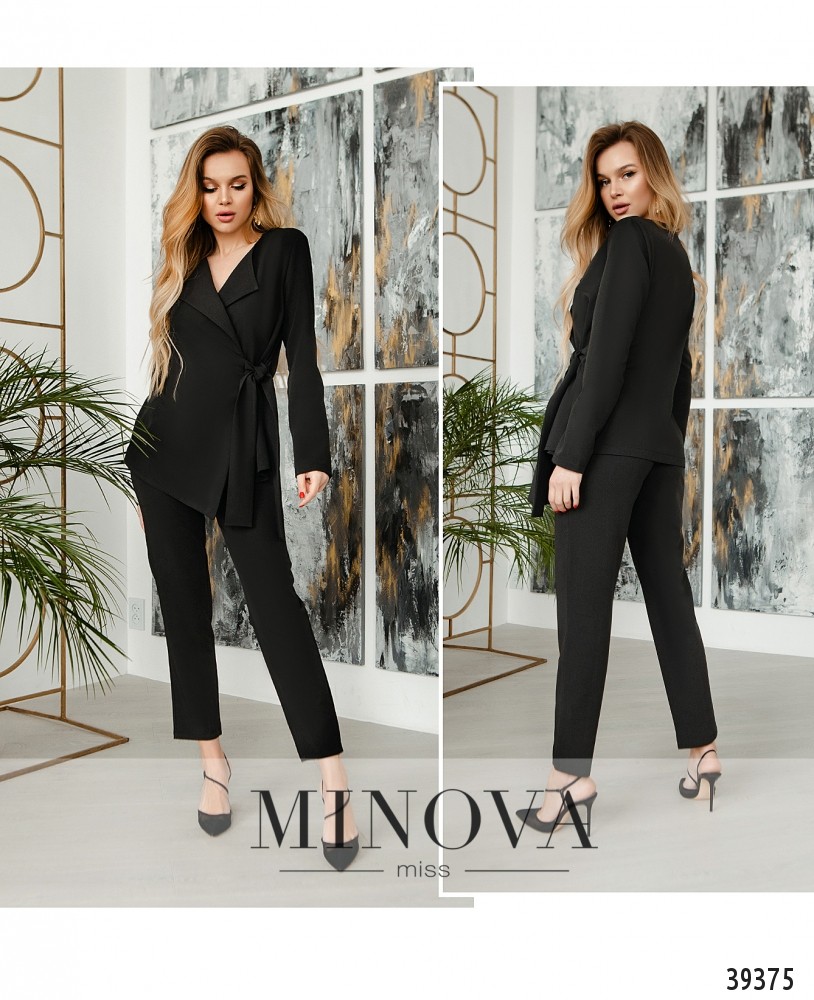 Минималистичный привлекательный костюм с жакетом и брюками. Жакет с подплечниками, без карманов, без застёжек, завязывается на подшитый сбоку поясок. Рукава без манжет. Подкладки нет. На груди вытачки. Брюки со средней посадкой, застёгиваются на змейку под ширинкой и на пуговицу, по бокам - врезные карманы, без манжет. На поясе - шлевки для ремня.