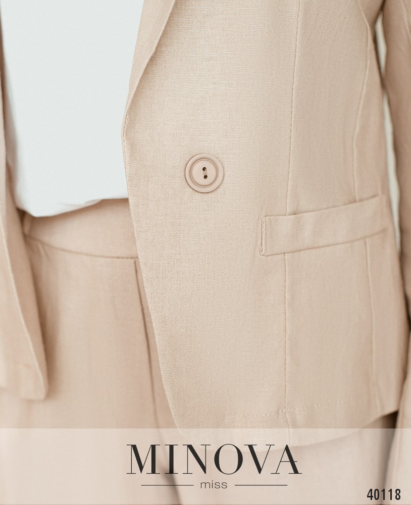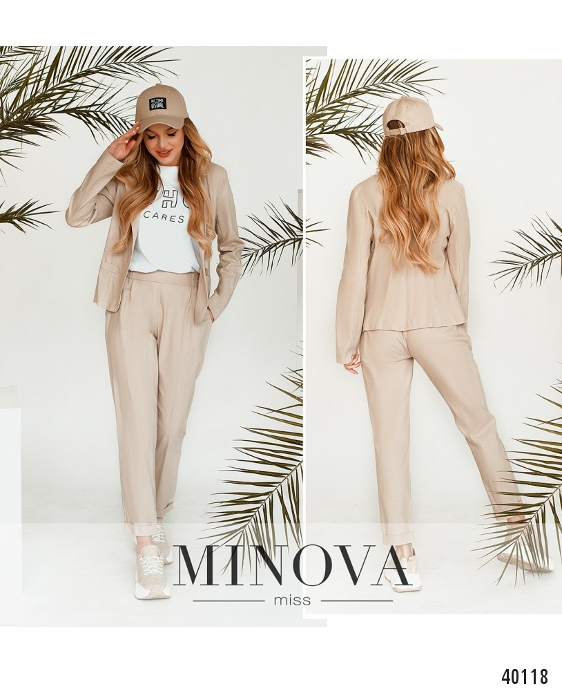 Очаровательный костюм-двойка с пиджаком и брюками. Пиджак без подкладки, однобортный, по бокам - декоративные клапаны, рукава без пуговиц и без манжет. Брюки с подворотами, в пояс сзади вшита резинка, по бокам врезные карманы, в наличии декоративная ширинка. Посадка высокая.