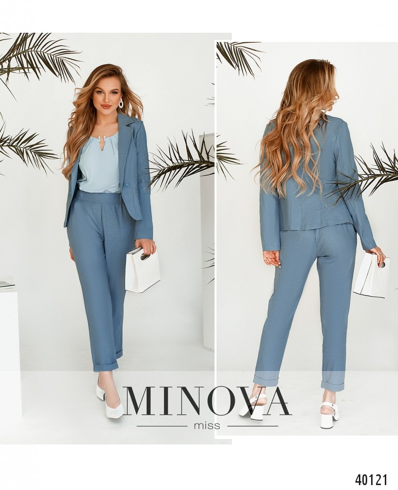 Очаровательный костюм-двойка с пиджаком и брюками. Пиджак без подкладки, однобортный, по бокам - декоративные клапаны, рукава без пуговиц и без манжет. Брюки с подворотами, в пояс сзади вшита резинка, по бокам врезные карманы, в наличии декоративная ширинка. Посадка высокая.