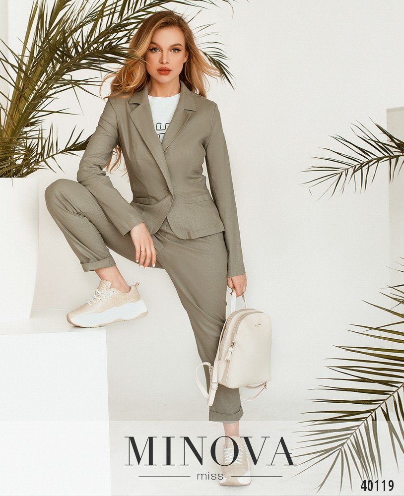 Очаровательный костюм-двойка с пиджаком и брюками. Пиджак без подкладки, однобортный, по бокам - декоративные клапаны, рукава без пуговиц и без манжет. Брюки с подворотами, в пояс сзади вшита резинка, по бокам врезные карманы, в наличии декоративная ширинка. Посадка высокая.