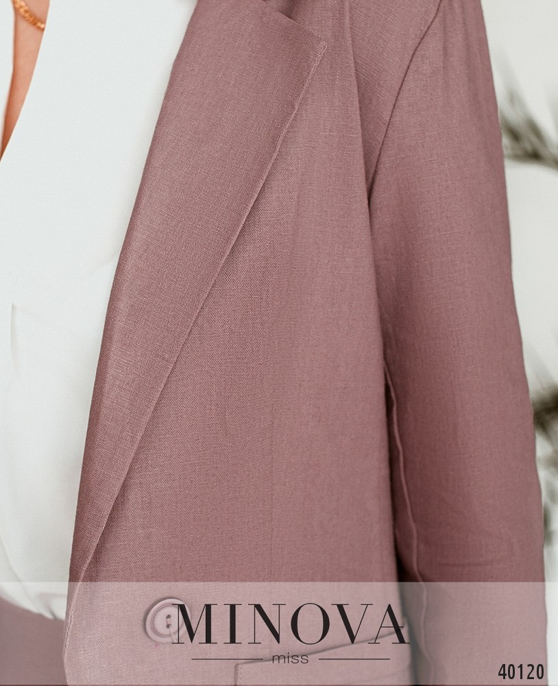 Очаровательный костюм-двойка с пиджаком и брюками. Пиджак без подкладки, однобортный, по бокам - декоративные клапаны, рукава без пуговиц и без манжет. Брюки с подворотами, в пояс сзади вшита резинка, по бокам врезные карманы, в наличии декоративная ширинка. Посадка высокая.