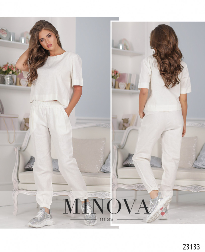 Удобный повседневный минималистичный костюм-двойка с футболкой и брюками. Брюки с высокой посадкой, в пояс вшита резинка, в манжеты также вшиты резинки, по бокам - врезные карманы. Футболка без карманов и застёжек.