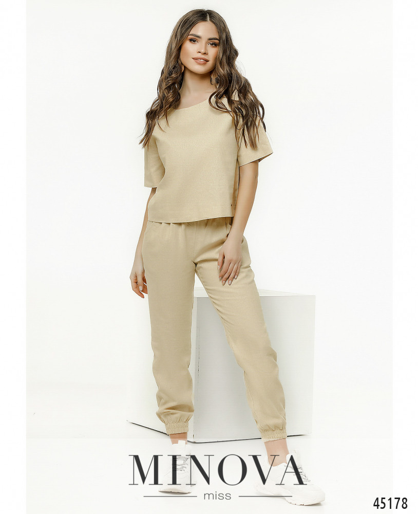 Удобный повседневный минималистичный костюм-двойка с футболкой и брюками. Брюки с высокой посадкой, в пояс вшита резинка, в манжеты также вшиты резинки, по бокам - врезные карманы. Футболка без карманов и застёжек.