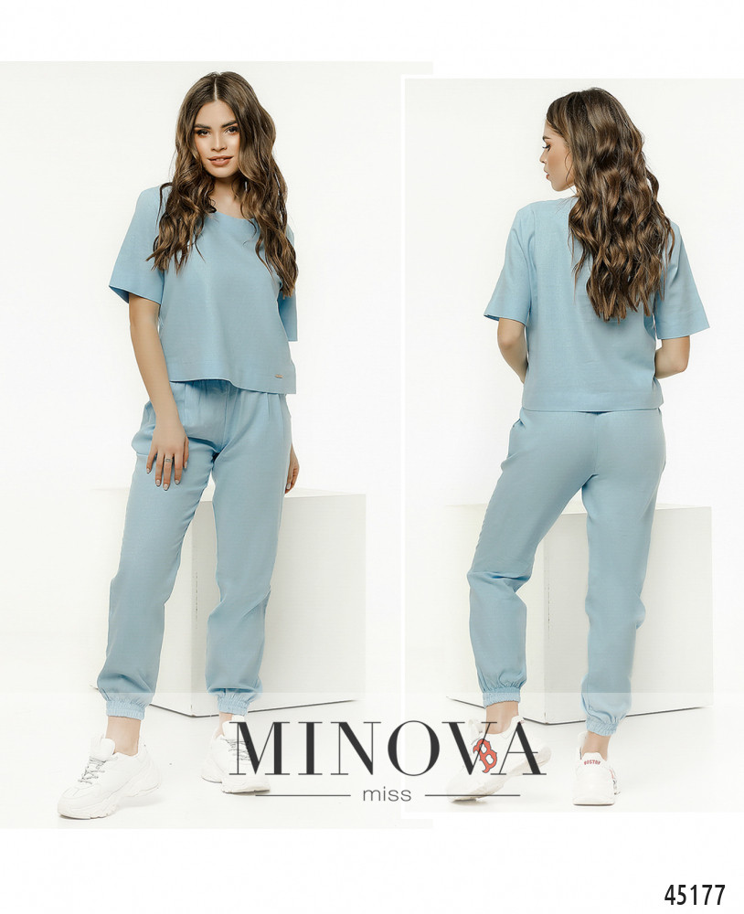 Удобный повседневный минималистичный костюм-двойка с футболкой и брюками. Брюки с высокой посадкой, в пояс вшита резинка, в манжеты также вшиты резинки, по бокам - врезные карманы. Футболка без карманов и застёжек.