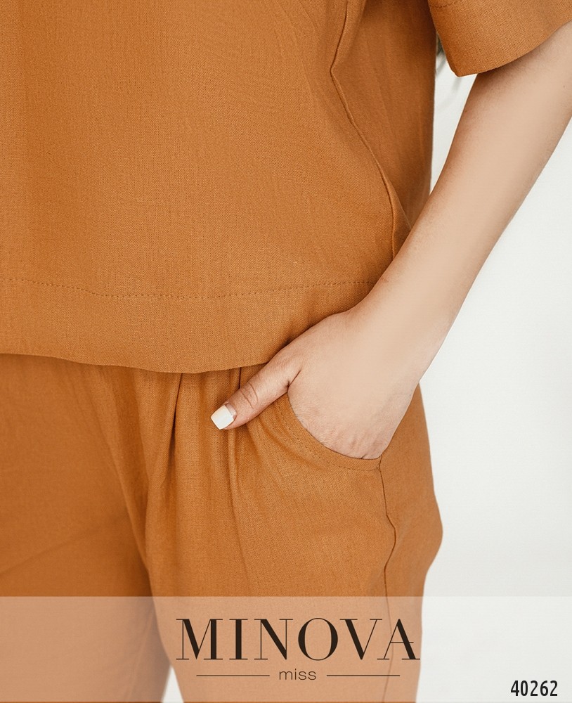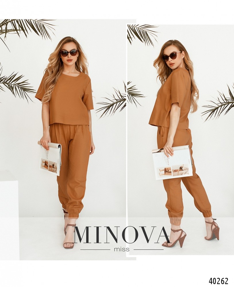 Удобный повседневный минималистичный костюм-двойка с футболкой и брюками. Брюки с высокой посадкой, в пояс вшита резинка, в манжеты также вшиты резинки, по бокам - врезные карманы. Футболка без карманов и застёжек.