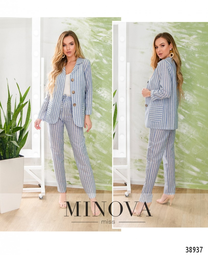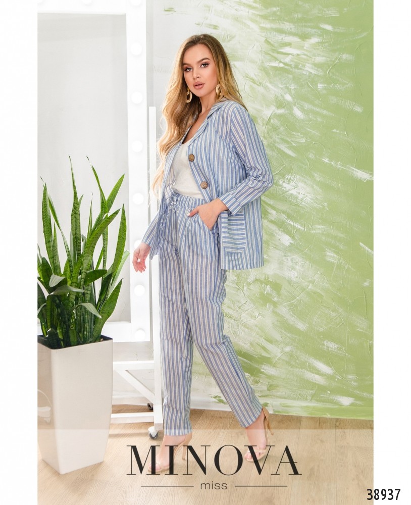 Очаровательный костюм-двойка с жакетом и брюками. Брюки с высокой талией, в пояс вшита резинка и пропущен шнурок, по бокам - врезные карманы. Жакет однобортный, с тремя пуговицами, без подкладки. Рукава без манжет. По бокам - накладные карманы.