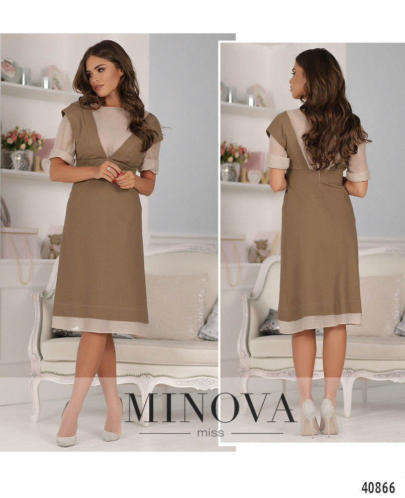 Оригинальный костюм с сарафаном и лёгкой кофточкой. Сарафан без карманов, застёгивается на молнию, вшитую по спинке. Снизу на подоле подшита лёгкая ткань, как на блузе. Вырез украшен спереди и по спинке декоративной строчкой-швом. Блуза без застёжек и карманов, с небольшими отворотами на рукавах, вырез горловины "лодочка".