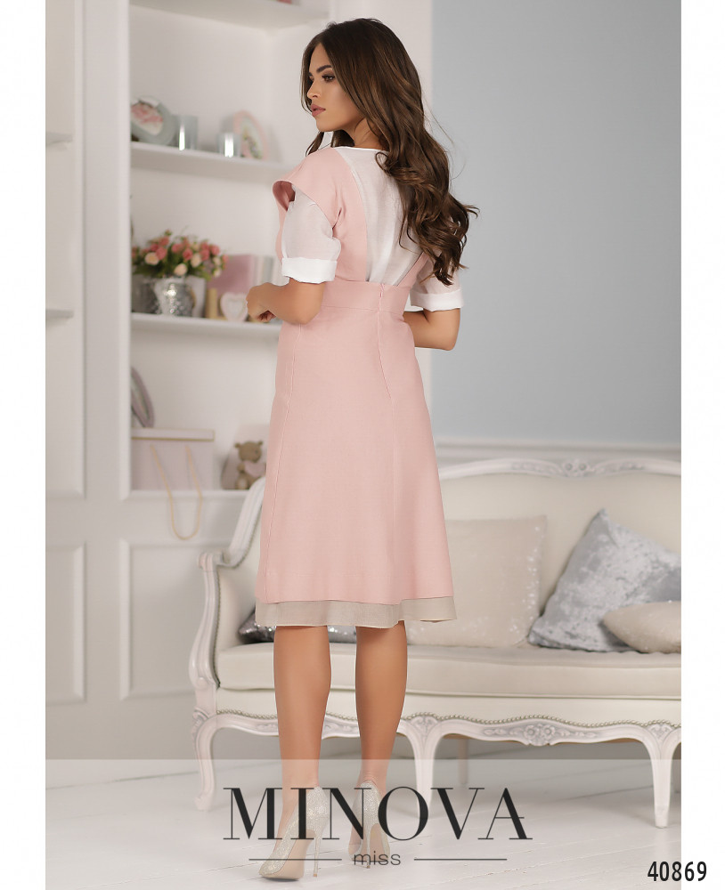 Оригинальный костюм с сарафаном и лёгкой кофточкой. Сарафан без карманов, застёгивается на молнию, вшитую по спинке. Снизу на подоле подшита лёгкая ткань, как на блузе. Вырез украшен спереди и по спинке декоративной строчкой-швом. Блуза без застёжек и карманов, с небольшими отворотами на рукавах, вырез горловины "лодочка".