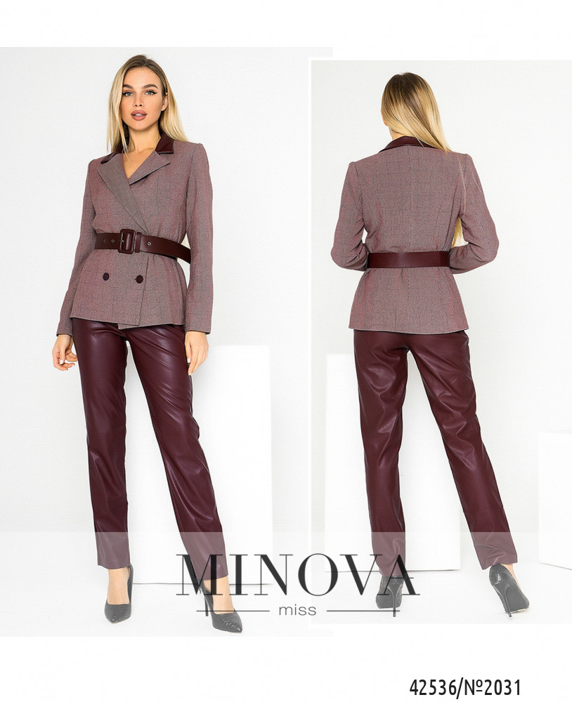 Оригинальный костюм-двойка с пиджаком и брюками. Пиджак с подплечниками и подкладкой, двубортный, застёгивается на левый ряд пуговиц. Верхняя часть лацканов из той же ткани, из которой изготовлены брюки. Ткань перфорирована. По бокам - врезные карманы. Брюки с высокой талией, изнутри ткань мягкая, застёгиваются на пуговицу и молнию под ширинкой. По бокам - врезные карманы, в наличии шлейки для ремня. Пояс в наличии, с несквозной декоративной перфорацией.
