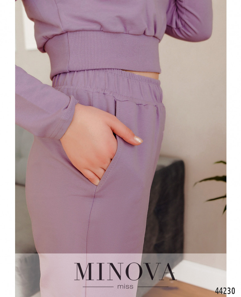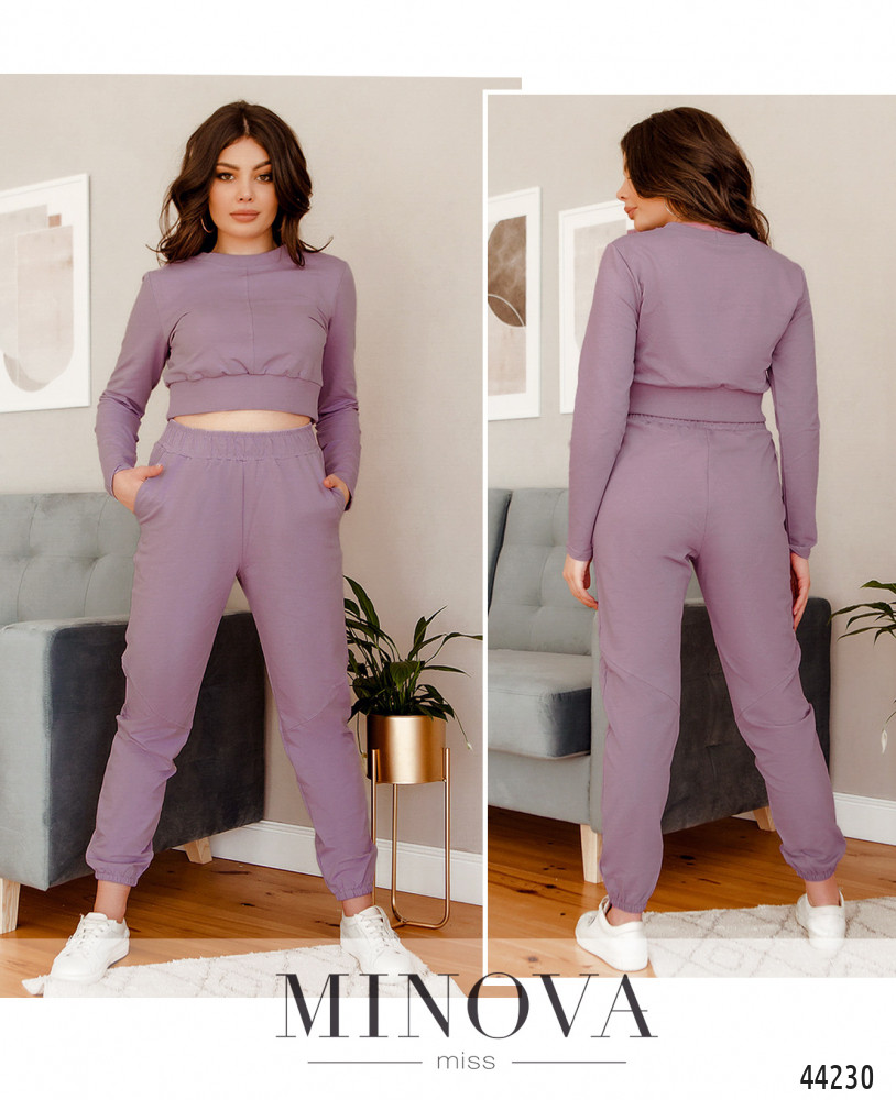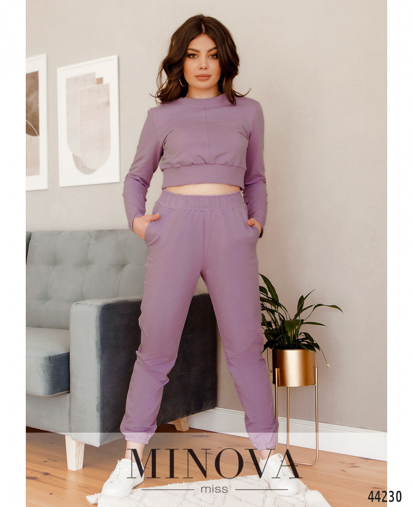 Минималистичный костюм со свитшотом и брюками. Свитшот с мягким манжетом на подоле и на горловине, рукава без манжет, по центру - декоративный шов. Без застёжек и карманов. Брюки со вшитыми в пояс и в манжеты резинками, с декоративным диагональным швом, по бокам - карманы в шве, посадка высокая.