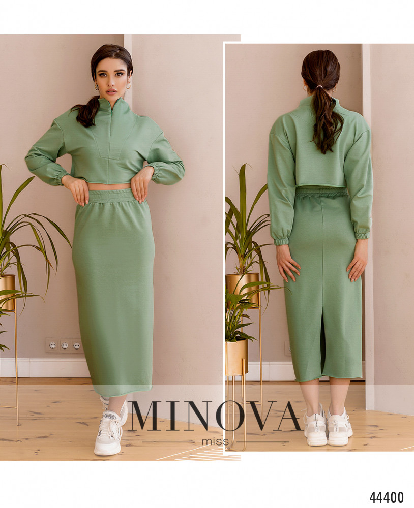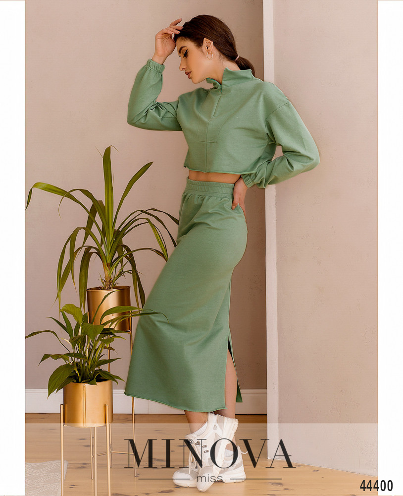 Удобный и нежный костюм с кофточкой и юбкой. Юбка-карандаш, в пояс вшита резинка, карманов нет, подол и шлица не обмётаны. Кофточка с необмётанным подолом, в манжеты рукавов вшиты резинки, застёгивается на вшитую спереди, от воротничка-стоечки до груди, потайную змейку. Карманов нет, в манжеты вшиты резинки, линия плеча приспущена. На груди диагональные декоративные швы.