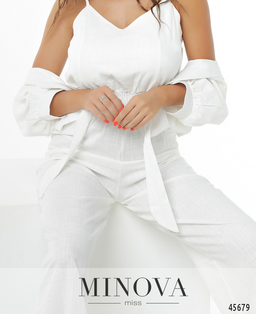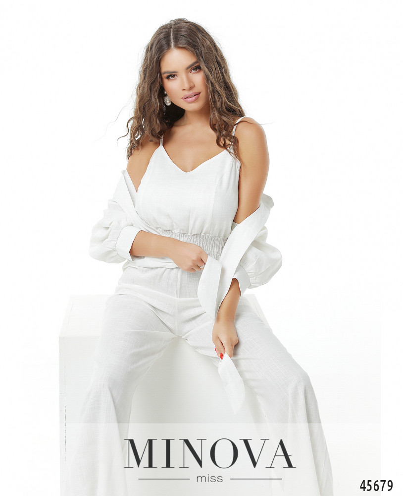 Стильный оригинальный костюм-двойка, выполненный из натуральной ткани, позволяет экспериментировать, создавая разные образы в зависимости от вашего настроения. Жарким летним днем наденьте легкий открытый комбинезон с широкой резинкой, делающей акцент на талии. Верхняя часть комбинезона на тонких бретелях оставляет открытыми плечи, а нижняя выполнена в виде легких свободных брюк прямого кроя. Вечером, когда жара спадет, накиньте сверху короткую рубашку в тон на пуговицах с рукавами длиной 3/4 и с завязками внизу.