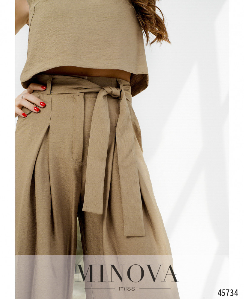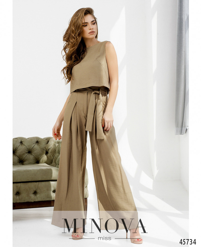 Минималистичный и оригинальный костюм, брюки расклешены, талия высокая, есть шлейки для пояса. Застёжка - молния под ширинкой и пуговка на талии. По бокам - карманы в шве, сзади на бёдрах от талии продольные вытачки. Топ без рукавов, карманов и застёжек, без резинки, вырез горловины спереди V-образный, сзади полукруглый.