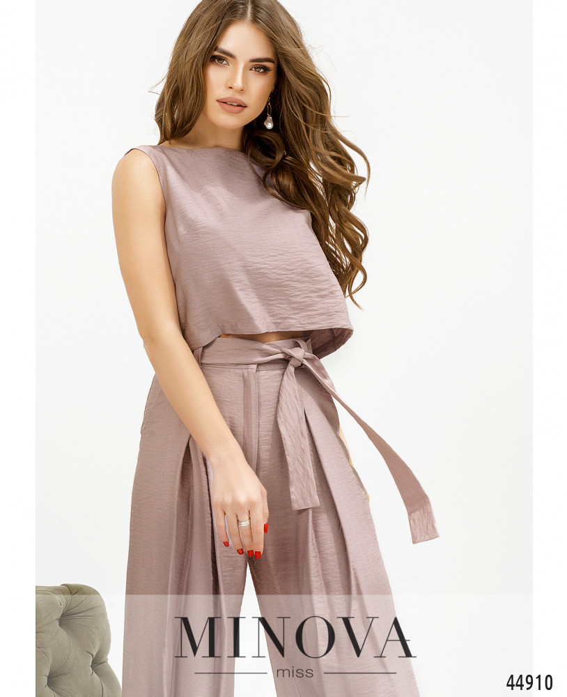 Минималистичный и оригинальный костюм, брюки расклешены, талия высокая, есть шлейки для пояса. Застёжка - молния под ширинкой и пуговка на талии. По бокам - карманы в шве, сзади на бёдрах от талии продольные вытачки. Топ без рукавов, карманов и застёжек, без резинки, вырез горловины спереди V-образный, сзади полукруглый.